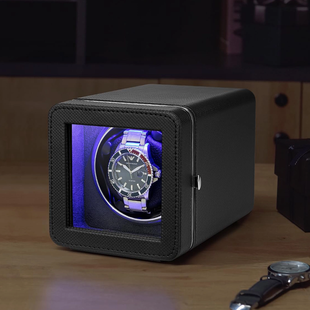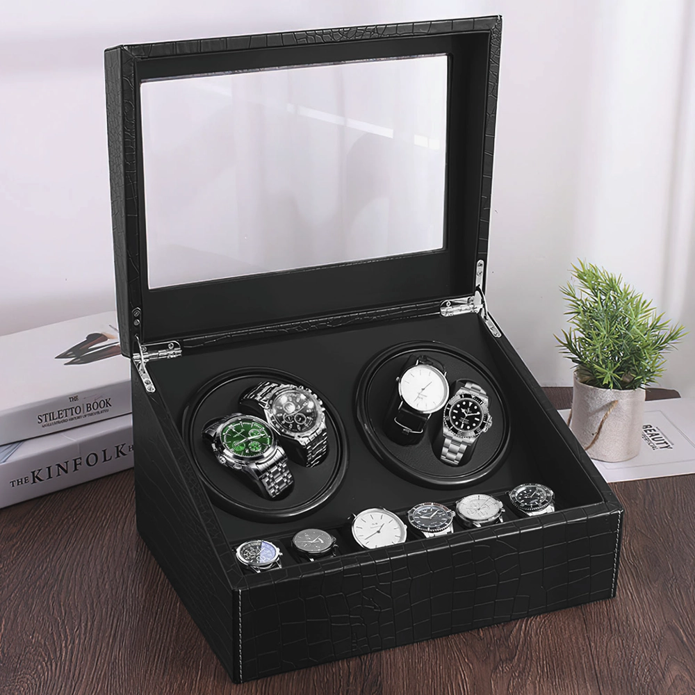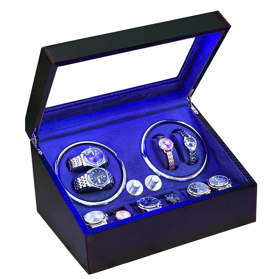 J&T Technology 4 Watch Winder for Automatic Watches,Watch Winder Box with 6 Watch Storages – LED Light,Quiet Mabuchi Motor,4 Rotation Modes,AC Adapter (Black Carbon Fiber Leather)(Black Carbon Fiber Leather)