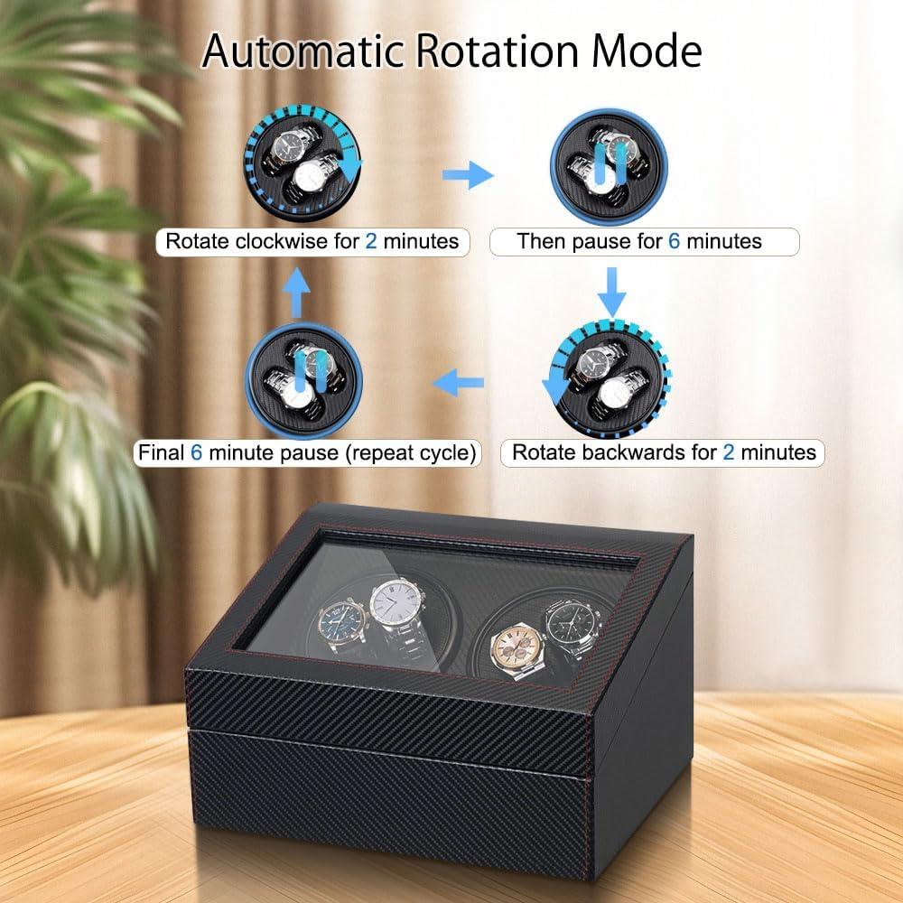 【4 Rotation Modes】The automatic watch winder has 4 rotation modes .OFF : Stop. Mode 1: Rotate clockwise for 2 minutes,stop for 6 minutes,cycle. Mode 2: Rotate counterclockwise for 2 minutes, stop for 6 minutes, cycle.Mode 3: Rotate clockwise for 2 minutes, stop for 6 minutes,Rotate counterclockwise for 2 minutes, stop for 6 minutes,cycle.Mode 4: Rotate clockwise for 5 minutes,counterclockwise for 5 minutes,run for 3hours,stop for 9 hours, cycle.